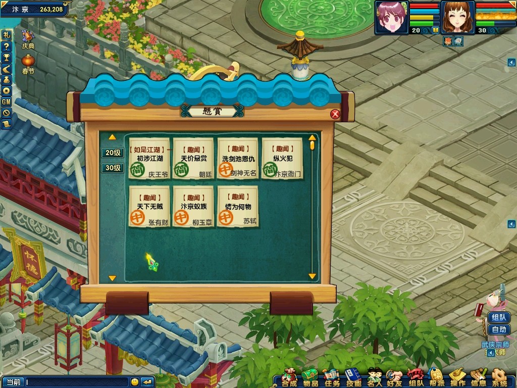 当角色等级大于等于20级后,可以在汴京的公告栏(258,206)处领取悬赏任务。悬赏任务中叙述着各种各样的奇人奇事,完成后可以获得丰富的经验、银票和各种道具奖励。