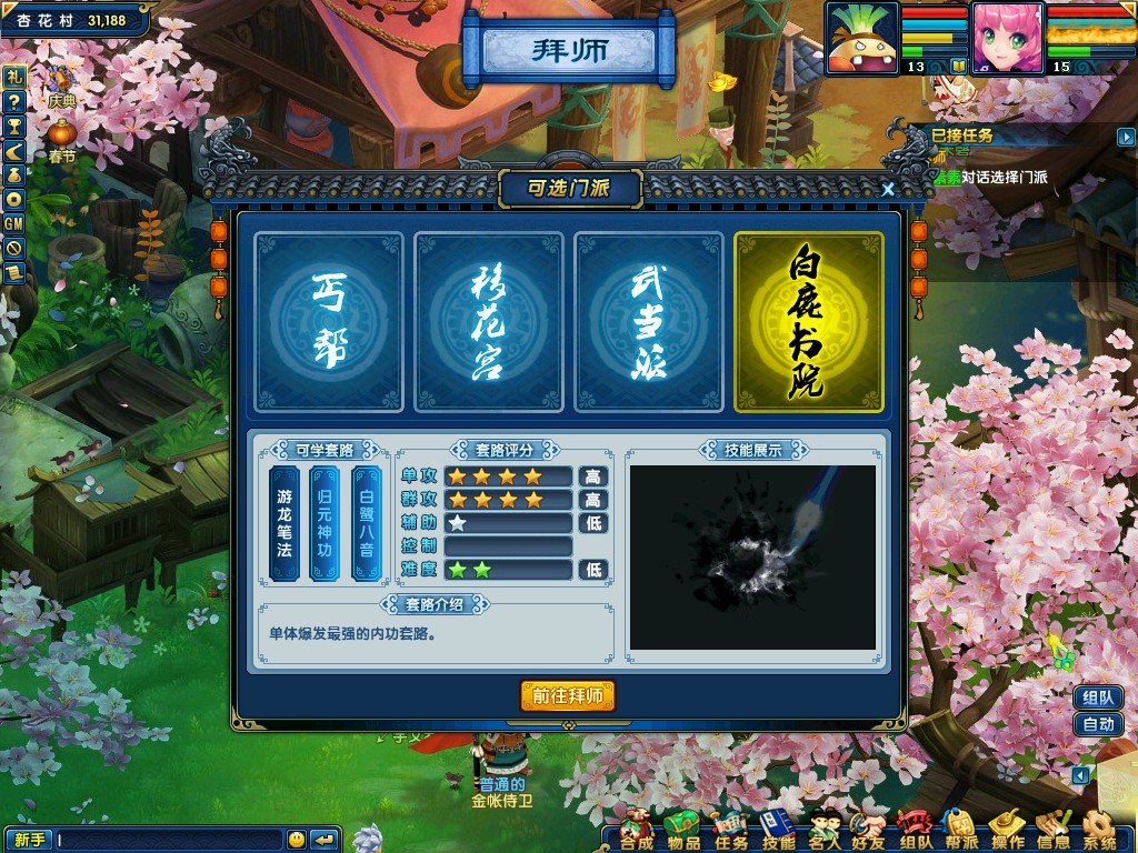 新手任务环节中最重要的一个环节,选择加入哪个门派。作为一个大家都心照不宣的江湖规矩,选择任意一个门派后都不允许再更换门派,因为尊师重道是行走江湖的重要准则。所以在选择门派时定要了解清楚各个门派的类型,是否符合自己需要。想了解各个门派吗?请点击八大门派