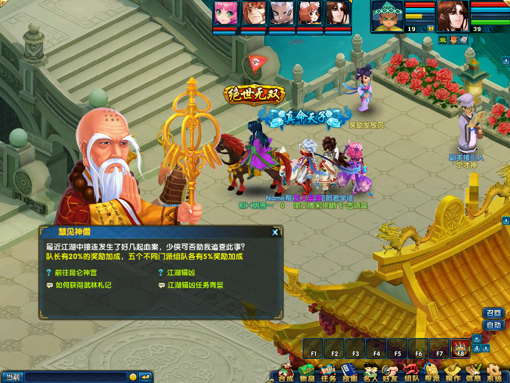 人物等级达到25级后,可组满5人队伍找汴京NPC慧见神僧(228,127)领取江湖缉凶任务。任务每10环为一轮,完成第10环,经验和物品奖励都非常丰富,是快速升级和赚钱的捷径。江湖缉凶任务作为队长还会有较高的额外经验加成。
