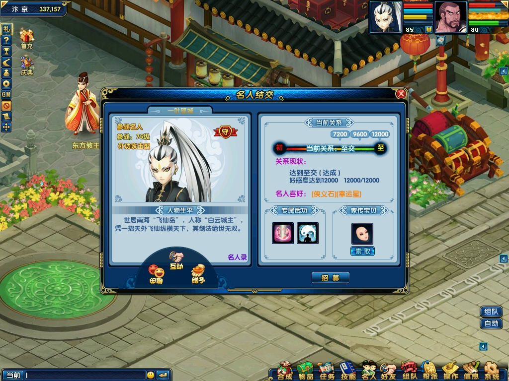 名人系统是《盖世豪侠》引以为豪的系统之一。众多的江湖侠客遍布世界,葬剑悲声,拈花恨意,吟唱着自身的故事。从一开始踏迹于这个世界,玩家就能够不断认识这些或意气风发、或怀古伤今的侠客名人。通过不同的方式与之熟悉到一定程度后,还能够招募为共同作战的伙伴。每个名人都有其独特的专属武功,这些武功对于战局的影响不可谓不大。此外,每个名人还有其专有的家传宝贝,与之成为至交后即会给予玩家提升相关属性。各有特色的名人恰是玩家行走江湖最有力,也最不能缺少的伙伴。