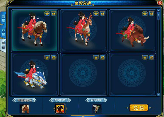 玩家有足够的坐骑饰品碎片后,就可以去汴京史金刚处兑换坐骑饰品。50个同样的碎片可以兑换一个相应的三星坐骑饰品;100个同样的碎片可以兑换一个相应的四星坐骑饰品。