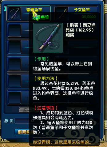 每天在浩荡的江湖世界中的冒险,战火纷飞剑影刀光,也许是时候该换一种节奏了,让时光缓慢推进,让我们可以在此刻细细品味当中的闲适怡情。≥45级的小伙伴可以到西夏灵州(162,95)渔夫大叔购买鱼竿来钓鱼,鱼竿分为普通鱼竿和子女鱼竿,子女鱼竿 同普通鱼竿,但不同的是可以有几率额外钓到子女用品哦,如智牌、童趣碎片(兑换子女装备)等道具哦!~放慢时光的脚步,品味悠闲的乐趣。