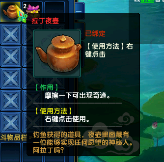 钓鱼不仅可以钓到各种各样的鱼,还有可能获得龟壳(兑换龙龟坐骑),更有可能获得实现愿望的拉丁夜壶哦,这个夜壶功能非常神奇,他可以让您获得大量的银票券,更可以实现与百晓生一样向全世界小伙伴们提问问题的求学之路哦!