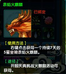 还在仰望那些炫酷的高级坐骑么,现在,只要你坚持,每天21:00到23:59内完成任务——挑战火麒麟,就有机会获得7天的五星坐骑赤焰火麒麟体验卡哦,下面就让我们欣赏五星坐骑的霸气的外表吧。