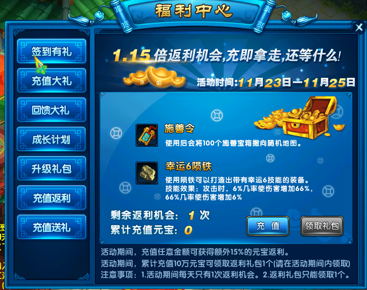 活动介绍:超高返利,充值即拿。活动期间,每位玩家每天第一次充值均可立即获得额外元宝返利,返利额度高达15%,充的越多,送的越多!同时,在活动期间内,累计充值达100000元宝还可额外领取“充值返利礼包”一个,包括1个施善令和一个幸运6陨铁。