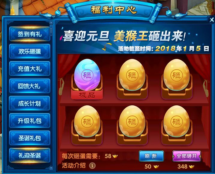 活动介绍:①玩家每天可以免费进行一次刷新,之后也可以手动刷新。②每次刷新均有概 率出现彩蛋,且有可能出现多个彩蛋。③砸彩蛋有一定几率砸出齐天大圣孙悟空。
