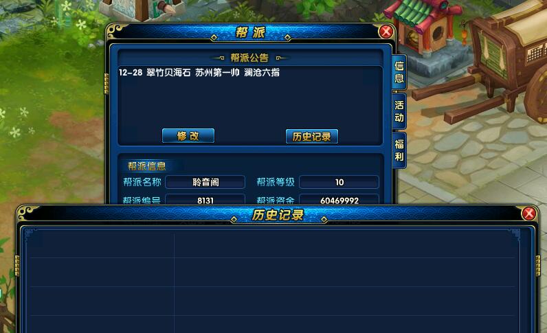 新增帮派历史公告,在帮派公告处新增历史公告入口,点击可以查看最近10条历史记录。
