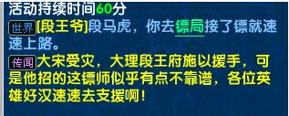 挑战时间BOSS:开服后前三天,每天晚上7:15开启活动。段马虎运送镖车途径大理-苏州-杏花村-汴京,镖车经过的地方会遗落大量宝箱,玩家可以点击宝箱拾取奖励。途中还会遇到世界boss劫镖。挑战成功之后可获得奖励。