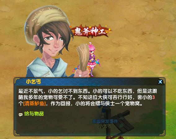 丐帮乞讨:最近不景气,小的乞讨不到东西,但是这跟随我多年的宠物可受不了。不知这位大侠可否行行好,小的他日必有重谢。