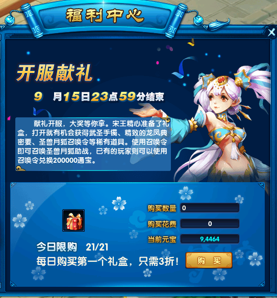 开服献礼:献礼开服,大奖等你拿。宋王精心准备了礼盒,打开就有机会获得武神手镯、精致的龙凤典密要、神兽月狐召唤令等稀有道具。