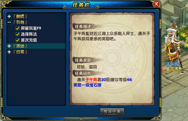 本次开服后,子午阵添加了每五关的任务引导,并且通过关卡后给予特定奖励;而且经验奖励相较于以前,有了非常大的提升,对于需要经验的我们来说是很大的诱惑。